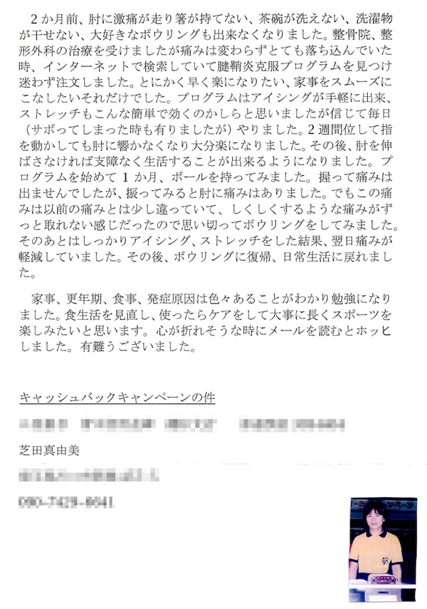 この度は、腱鞘炎改善の件で大変お世話になりました。